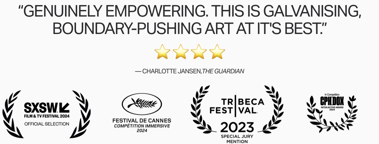 Her immersive film, ‘Maya: The Birth of a Superhero’ premiered at Festival de Cannes 2024 (in competition), CPH:DOX 2024 and SXSW 2024 and won the Special Jury Mention Award/Tribeca Film Festival, Won the Anidox Best XR Award and won the European XR Awards 2024. Recipient of a 4 star Guardian review, it exhibited at a special installation show at the Victoria & Albert Museum in London.